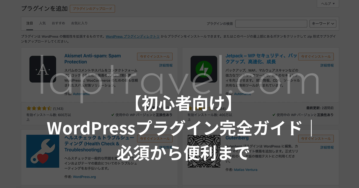 プラグインは便利ですが、数を増やすほどリスクも高まります。最初は必要最小限から始めて、必要になったときだけ追加するのがおすすめです。